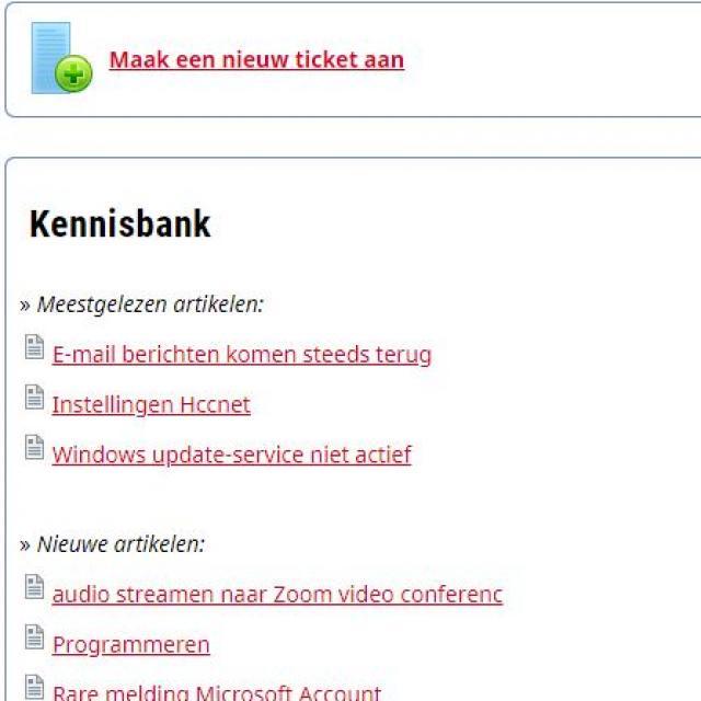De antwoorden op talloze technische kwesties vind je in eerste instantie op de HCC-website! Kijk daarvoor op HCC!vraagbaak. De Kennisbank is overzichtelijk ingedeeld en bevat een schat aan informatie. Grote kans dat jouw vraag daar beantwoord wordt. Zo niet, dan kun je zelf een vraag stellen door een nieuw ticket aan te maken. De deskundigen op dat specifieke terrein zullen je snel van een antwoord voorzien.